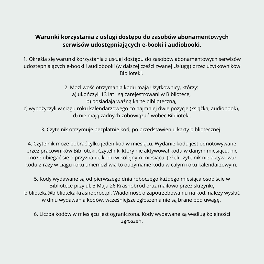 Kody są ważne przez miesiąc od momentu aktywacji – więc możecie przez 30 dni korzystać z bogatej oferty za darmo! Zgłoście się do biblioteki po bezpłatny kod dostępu i cieszcie się literaturą bez ograniczeń!