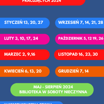 W soboty biblioteka będzie otwarta od stycznia do kwietnia a następnie od września do grudnia. W miesiącach letnich: maj – sierpień, biblioteka w soboty będzie nieczynna. Zachęcamy do zapoznania się ze szczegółowym rozkładem na plakacie.