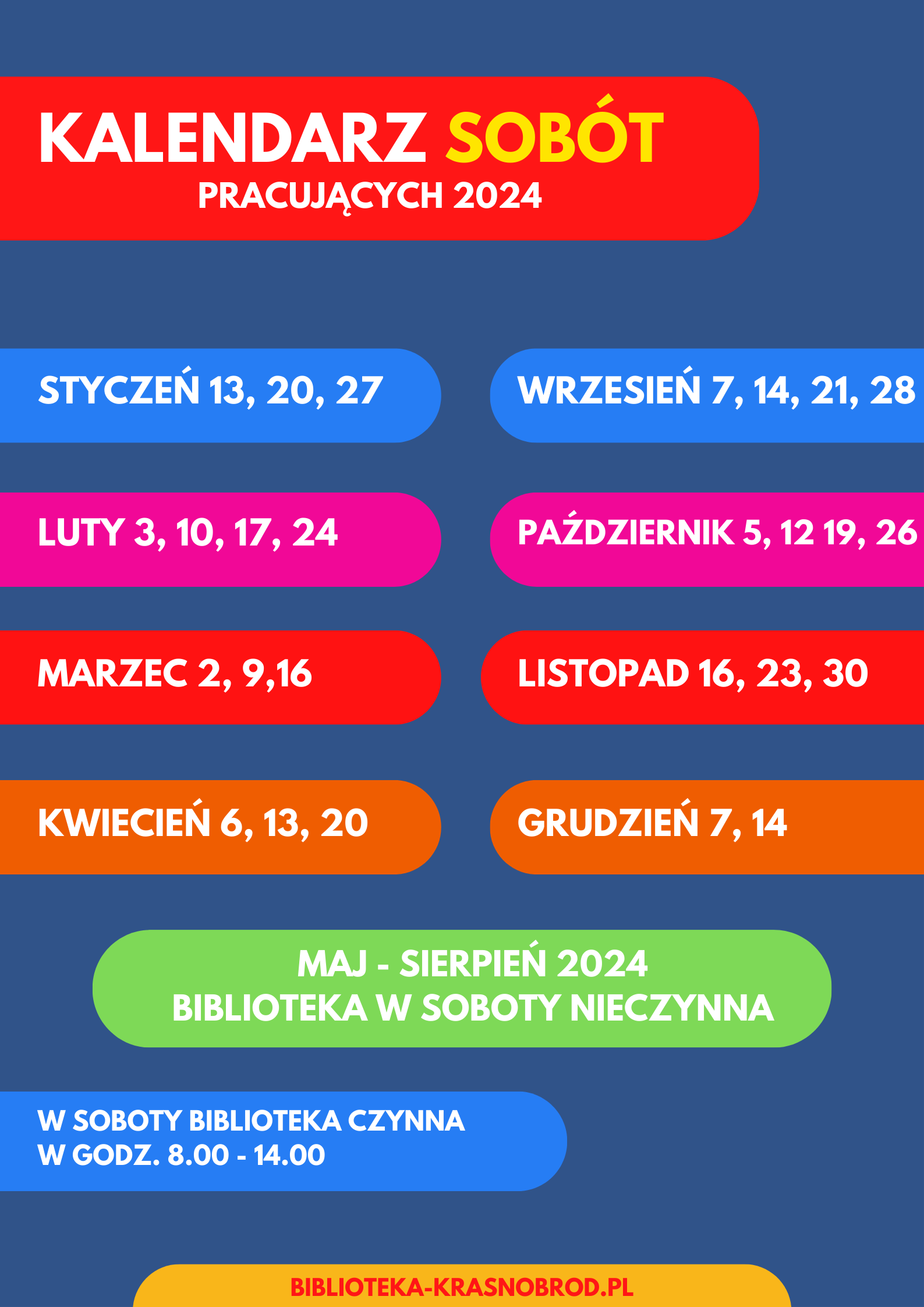 W zakładce na naszej stronie pojawił się kalendarz sobót pracujących w roku 2024 w Bibliotece Publicznej w Krasnobrodzie.