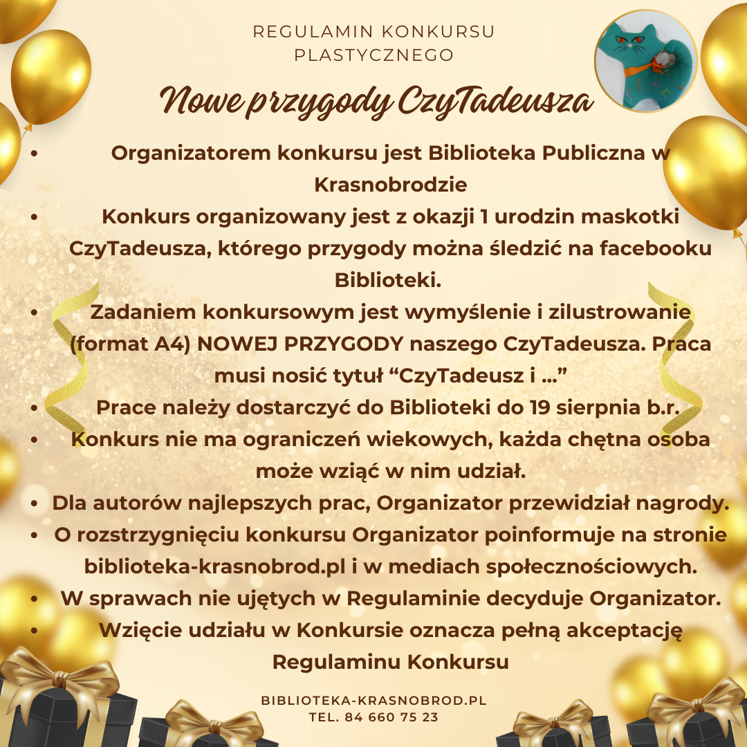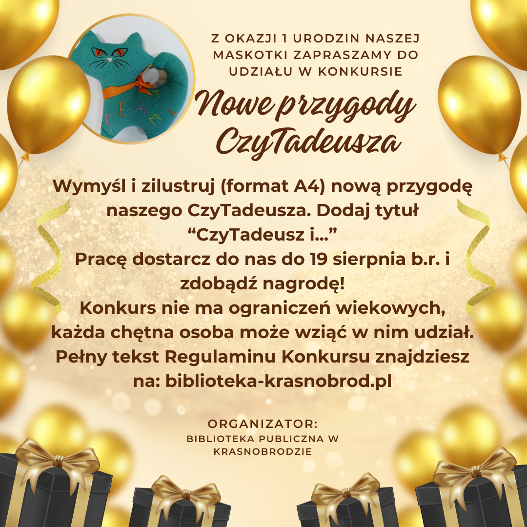Nowe przygody CzyTadeusza to hasło naszego nowego konkursu plastycznego. Zorganizowałyśmy go z okazji 1 urodzin naszej bibliotecznej maskotki Kota CzyTadeusza. Przez ostatni rok, CzyTadeusz przeżywał liczne przygody, które mogliście obserwować na facebooku naszej biblioteki. W związku z tym, zadaniem konkursowym jest pomysł na nową przygodę CzyTadeusza. Przygodę należy zilustrować w dowolnej technice w formacie maks. A4 i dostarczyć ją do nas do 19 sierpnia b.r. Pracę należy zatytułować w formacie „Kot CzyTadeusz i …”. Każda ilustracja powinna być opatrzona imieniem i nazwiskiem oraz telefonem kontaktowym.