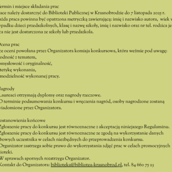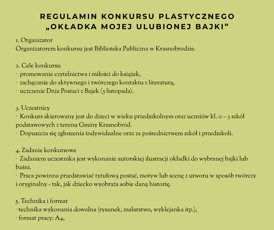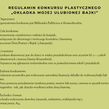 Konkurs przeznaczony jest dla dzieci w wieku przedszkolnym oraz uczniów klas 0 – 3. Zadaniem konkursowym jest zaprojektowanie okładki do swojej ulubionej bajki. Technika prac dowolna, format A4. Na prace czekamy do 7 listopada. Pełną treść Regulaminu znajdziecie na zdjęciach poniżej.