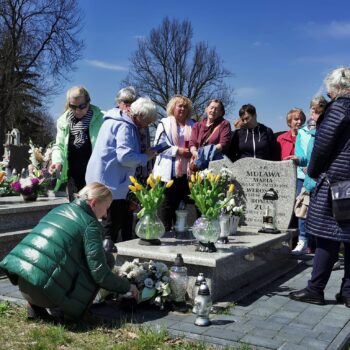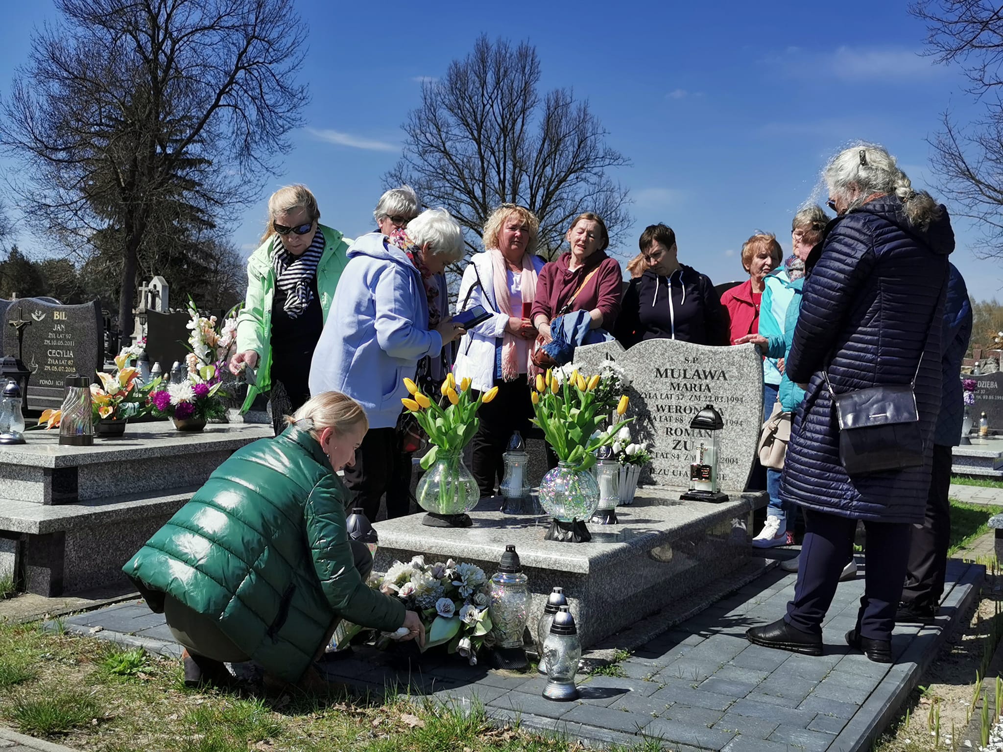 Spacer Aleją Najświętszej Marii Panny był powodem do kolejnych wspomnień naszych gości, bowiem przy tejże właśnie alei, znajdował się niegdyś rodzinny dom Pana Zuba. Na dłuższą chwilę zatrzymaliśmy się w krasnobrodzkim sanktuarium skąd wyruszyliśmy na miejscowy cmentarz. Wizyta przy grobie Pana Romana, przyniosła naszym gościom najwięcej wzruszeń. Cichą modlitwą, kwiatami oraz zapalonymi zniczami, uczcili Jego pamięć. Chwila była niezwykle wzruszająca ponieważ wśród uczestników wycieczki były osoby, będące wychowankami „wujka”, bo tak również Go nazywano.