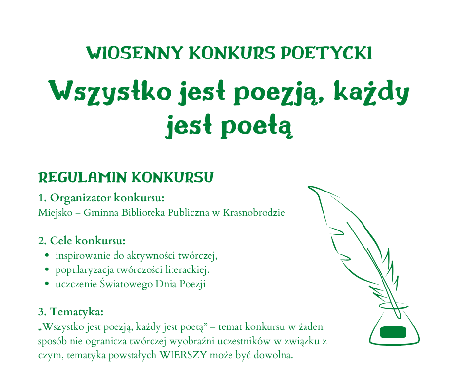 Wiosenny Konkurs Poetycki WSZYSTKO JEST POEZJĄ, KAŻDY JEST POETĄ to nasza propozycja na uczczenie Światowego Dnia Poezji. Święto to ustanowione przez UNESCO, przypada na 21 marca. Celem tego dnia jest promocja czytania, pisania, publikowania i nauczania poezji na całym świecie. UNESCO zadeklarowało, że ten dzień ma „dać nowy impuls, aby docenić poezję oraz poprzeć krajowe, regionalne i międzynarodowe ruchy poetyckie”.