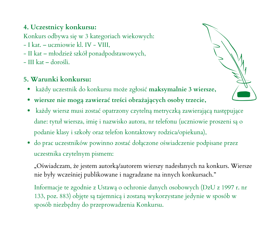 Udział w konkursie mogą brać osoby z trzech kategorii wiekowych: 1. uczniowie kl. IV – VIII, młodzież szkół ponadpodstawowych oraz dorośli. W każdej z tych kategorii przewidujemy nagrody i wyróżnienia. O terminie wręczenia nagród, laureatów powiadomimy telefonicznie lub mailowo, informacja taka ukaże się również w mediach społecznościowych Biblioteki.