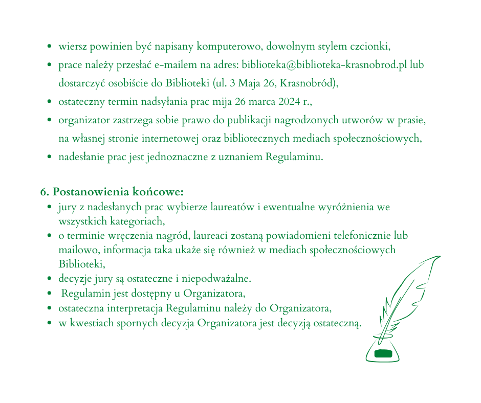 Pełny tekst Regulaminu znajduje się w poniższych załącznikach. Dodatkowych informacji udzielamy pod nr. tel. 84 660 75 23 lub drogą elektroniczną biblioteka@biblioteka-krasnobrod.pl.