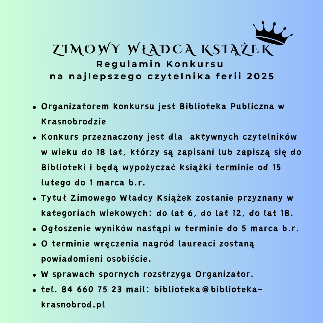 Zimowy Władca Książek to nasz najnowszy pomysł na konkurs czytelniczy. To zabawa, którą proponujemy Wam na nadchodzące dwa tygodnie, czyli okres ferii zimowych. Kto zostanie Zimowym Władcą Książek? Ten, kto wypożyczy i przeczyta, jak największą ilość książek z naszej biblioteki w czasie ferii czyli od 15 lutego do 1 marca b.r. Ogłoszenie wyników nastąpi w terminie do 5 marca b.r. a o terminie wręczenia nagród laureaci zostaną powiadomieni osobiście.